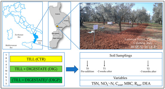 The trial commenced at the end of March 2017 in field plots measuring 20 m × 12 m each, arranged in a randomized complete block design (RCBD) with four replications (Figure S2). Three different treatments were evaluated, including the following ones: (1) an unamended control (CTR), subjected to inter-row harrowing at a depth of approximately 20 cm; (2) the application of solid digestate (DIG) at a rate of 30 t ha−1 (consistent with the common dose used by local farmers and in accordance with Barra Caracciolo et al. [37] and Badagliacca et al. [34]), which was incorporated into the soil through harrowing; (3) repeated solid digestate application (DIGP), where the digestate was applied at the same rate and using the procedure employed in DIG for two consecutive years (the previous cropping season 2016/17, i.e., 8 April 2016, and the experimental year 2017/18, i.e., April 2017) (Figure 1 and Figure S2).