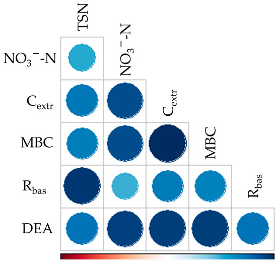 As outlined by Pearson’s correlation analysis, all the soil variables investigated showed significant correlations (p < 0.05) with each other (Figure 3). With regard to the DEA, the strongest correlations were observed with NO3−-N (r = 0.92), Cextr (r = 0.93), and MBC (r = 0.93).