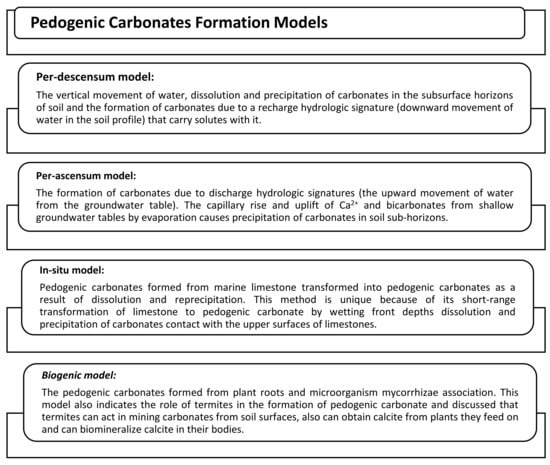 According to Monger [27], other than shallow lakes and deep groundwater geologic factors, the formation of pedogenic carbonates can be divided into four models, which are described in Figure 3.