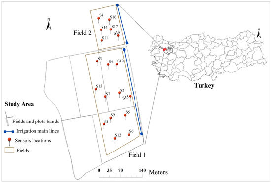 The experimental maize fields were located in Bakırköy village of Karacabey, Turkey (40°08′22.61″ N, 28°22′58.7″ E). An 8.2 ha field named Field 1 (F1) and a 2.5 ha field named Field 2 (F2) were selected for the experiment (Figure 1). The soil texture in these fields was composed of 37.6% clay and 32.3% sand in Field 1, and 30.3% clay and 35.3% sand in Field 2. The type of the soil in this study area is alluvial [33]. The fields have approximately rectangular shapes and are irrigated using a closed-loop pressurized wide-area drip irrigation system operated by an irrigation union in the district. The field experiment was conducted during the 2022 growing season. Maize seeds were planted on 16 May 2022 for Field 1 and on 11 May 2022 for Field 2, with the first drip irrigation performed on July 2 for both fields.