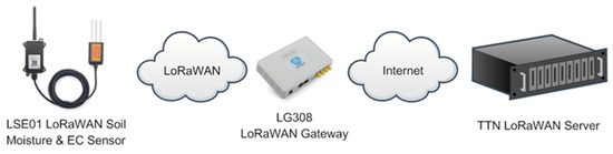 - Dragino LSE01-LoRaWAN Soil Moisture & EC Sensor User Manual. Available online: https://www.dragino.com/products/agriculture-weather-station/item/277-se01-lb.html (accessed on 17 June 2023).