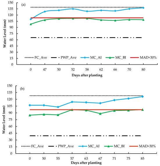 At the early growth stages of maize plants, the penetration of the maize roots is shallower than in the later stages [3]; thus, maintaining the topsoil moisture should be more important to avoid water stress. The soil tended to generate cracks owing to the lack of moisture, especially during windy periods that are common in the region. Therefore, it may be recommended to start irrigation earlier than occurred because the measured MC values before irrigation were lower than the MAD + 30% values. MC values below the MAD + 30% value in Figure 3a,b suggest that plants might have experienced water stress during the early growth stages. To prevent this, frequent and sufficient irrigation could have been determined using the sensor-based data.