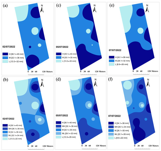 The H level irrigation rate corresponded to areas from 0.89 ha to 32.6 ha with five-zone analysis in F1 whereas three-zone analysis resulted in 0.14 ha to 14.3 ha for H level rates on different irrigation days. Dividing the field into management zones shows that different parts of the field require different application rates to bring the soil MC to the FC. Five zones depicted the distribution of the rates more precisely for each irrigation date. In F2, the zone areas were smaller due to the smaller field size compared to that of F1. The CV values from about 45–65% both for F1 and F2 also show that the application rates for each zone need to be changed significantly over time. For instance, the CV level of 46.7% for M level area in the five-zone analysis was found in areas ranging from 3.0 ha (21 July) to 13.87 ha (4 August). The IN maps shown in Figure 5, Figure 6, Figure 7 and Figure 8 are not readily applicable because of the lack of precise application technologies that can deliver irrigation water based on contour maps. The length of the lateral pipes in a drip irrigation system is designed to be the same length in each management zone in sub-plot areas of up to four hectares in the current practices in the Karacabey district, intersecting with the simulated IN maps. Furthermore, the dynamic variation in the irrigation management zone from one irrigation to the next requires an irrigation system that can respond accordingly.
