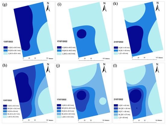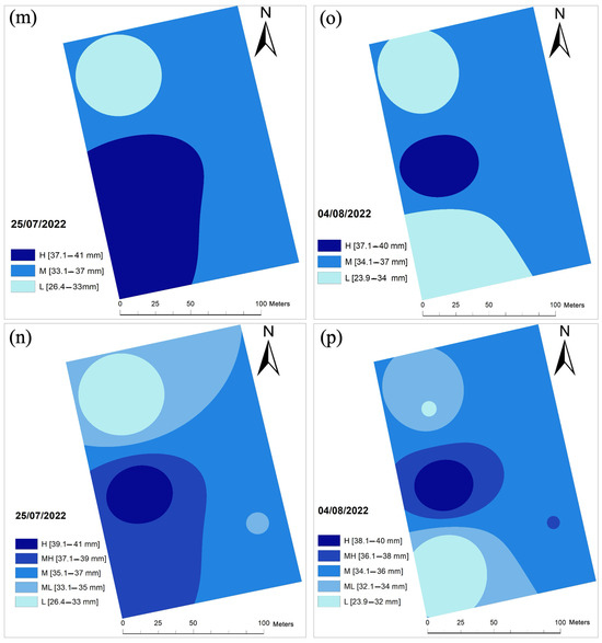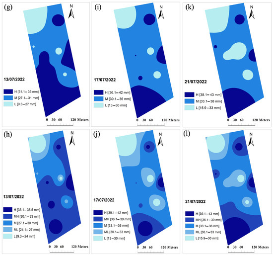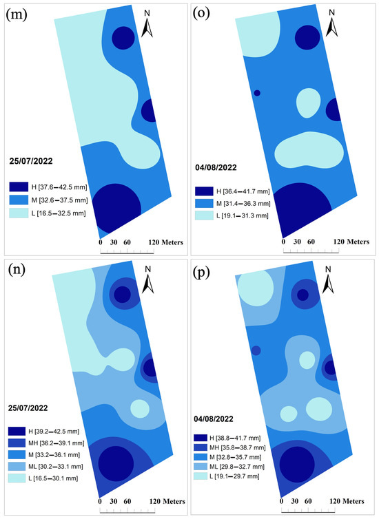Three and five irrigation management zones maps for Field 1 for different irrigation dates in 2022: (a,b), 2 July; (c,d), 5 July; (e,f), 7 July; (g,h), 13 July; (i,j), 17 July; (k,l), 21 July; (m,n), 25 July; and (o,p), 4 August.