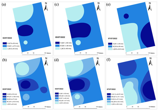 Figure 4 and Figure 5 show the three- and five-zone irrigation management zones for F1 and F2. These figures show the same patterns in irrigation needs with different precisions with low (L), medium-low (ML), medium (M), medium-high (MH), and high (H) application rates.