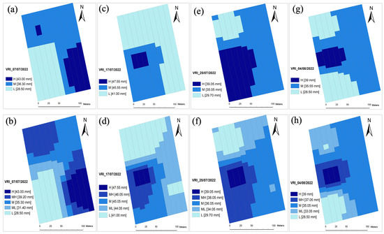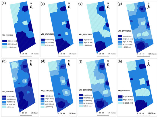 Three- and five-MZs maps for VRI using VRFM for Field 2 onselected irrigation days in 2022: (a,b), 7 July; (c,d), 17 July; (e,f), 25 July; and (g,h), 4 August.