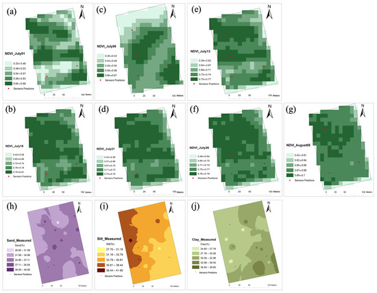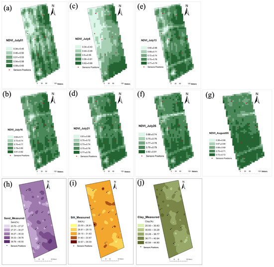 NDVI for a given dates (a–g) and soil texture (sand, silt, and clay) (h–j) maps for Field 1.