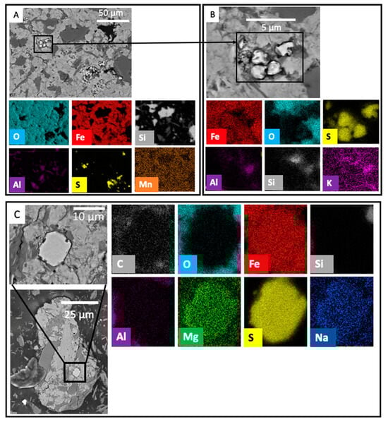 Representative SEM backscattered electron images and EDS elemental maps of a grain consistent with an Fe sulfate grain in an aggregate with clay particles ((A), site 1), and discrete particles of Fe sulfate ((B,C), site 2). The black box in (C) indicates where EDS element maps were collected.