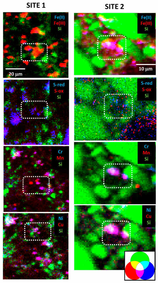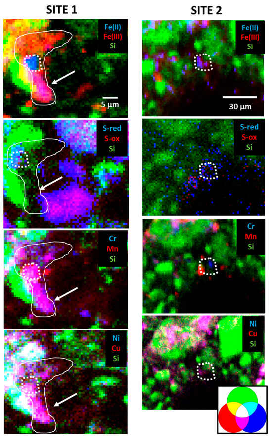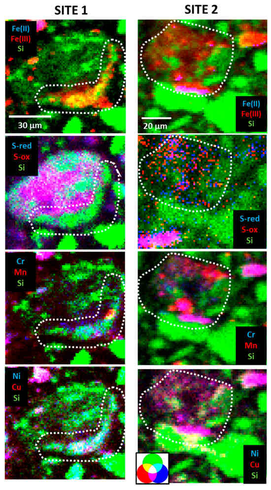 Representative μ-XRF images for pyrite replaced with Fe oxides (regions in white-dashed lines); structures observed in the SEM–EDS analyses were not able to be observed at the resolution of the μ-XRF analyses; however, pyritic cores with oxidized rims were observed. The images include redox maps (for Fe and S) and elemental maps (for Si, Cr, Mn, Ni, and Cu) for the samples from site 1 (left column) and site 2 (right column). The Fe and S maps are shown as two-component images (Fe(II) and Fe(III); Sred and Sox) plus Si for orientation relative to the other maps. The color key is shown at the bottom right.