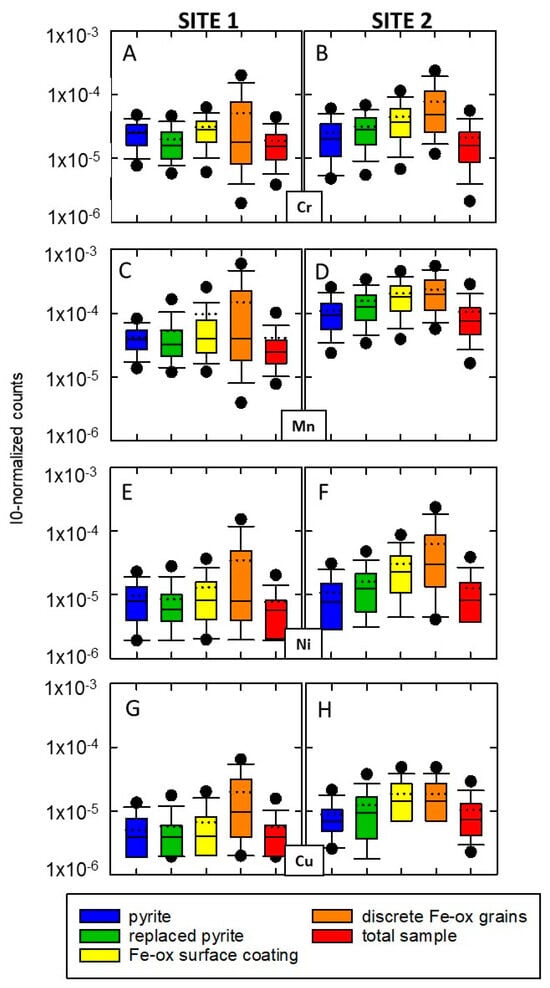 Box-and-whisker plots showing I0-normalized m-XRF counts as a proxy for the concentrations of Cr (A,B), Mn (C,D), Ni (E,F), and Cu (G,H) in the samples from sites 1 (left) and 2 (right) as a function of the type of Fe-bearing host phases: pyrite (blue), pseudomorphic replacement of pyrite with Fe oxides (green), Fe oxide surface coatings (yellow), and larger discrete grains of Fe oxides (orange). The range of total metal counts for the m-XRF maps is shown in red. Median values are shown as black-dashed lines, and the black circles represent the 5th and 95th percentile of outliers.