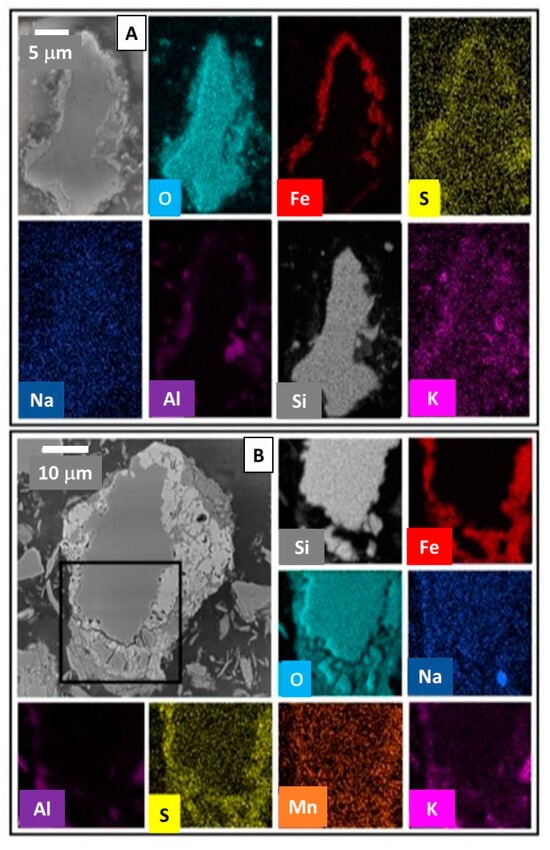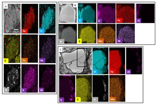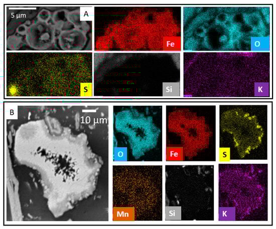 Discrete Fe-bearing grains, ranging in size from 10 μm to 20 μm to over 200 μm, were observed that were typically irregularly shaped with compositions dominated by Fe-O-S and were likely Fe(III)-(oxy)hydroxides-sulfates. Some of these discrete grains contained Si-rich inclusions (Figure 9A) and were likely clay grains incorporated during precipitation, whereas other discrete grains appeared to be relatively homogeneous single crystals (Figure 9B,C). The inclusion-bearing grains tended to have slightly lower S concentrations compared to the inclusion-free grains. Some of the larger discrete Fe grains were covered in fine-grained Si–O–Al–K-rich phases that are likely clay minerals and were up to 20 μm in thickness (Figure 9C).