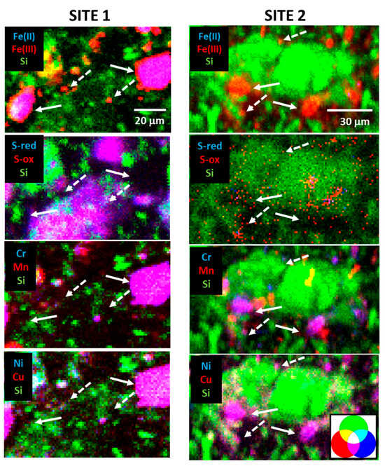 Representative μ-XRF images for discrete Fe oxide particles ranging from larger grains (solid white arrows) to smaller grains (white-dashed arrows), including redox maps (for Fe and S) and element maps (for Si, Cr, Mn, Ni, and Cu) for the samples from site 1 (left column) and site 2 (right column). The Fe and S maps are shown as two-component images (Fe(II) and Fe(III); Sred and Sox) plus Si for orientation relative to the other maps. The color key is shown at the bottom right.