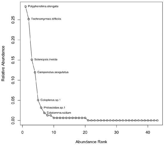 Rank abundance curve (“Whittaker plots”), showing the relative abundance of species characterizing in agroecological market-gardening cropping system (AG), 18 months after the experiment setup (Godet Petit-Canal, Guadeloupe).