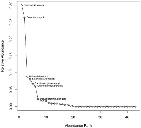 The total of number of macrofauna species collected at T18 was the same (20) in AG and AGSPP. The Shannon index ranged between 1 and 4.5. The mean Shannon index was 2.10 in AGSPP and 2.04 in AG at T18. Some species were present in both cropping systems, such as Solenopsis invicta Buren, Camponotus sexgutattus Cristobal, Cardiocondyla emeryi Forel (Formicidae), Tetragnathidae sp. (Arachnida), Aphididae sp. (Hemiptera), Platyarthridae sp. and Philosciidae sp. (Isopoda), the earthworm Polypheretima elongata Perrier, the Coleoptera Colopterus sp., the Dermaptera Euborellia annulipes Lucas, the Arachnida Thomisidae sp. and the Myriapoda Geophilidiae sp. Some other species were only found in AGSPP, such as the Formicidae Cyphomyrmex minutus, the Staphilinidae Cafius sp. and the earthworm Pontoscolex corethrurus Müller. The macrofauna communities differed significantly in both treatments (ANOSIM, R = 0.46, p = 0.024). The rank abundance curve showed that P. elongata and Technomyrmex difficilis Forel (Formicidae) were the two main abundant species in AG compared to S. invicta and Colopterus sp. in AGSPP (Figure 2 and Figure 3). Regarding earthworms, we found an average of 144 ± 46 ind·m−2 in AG plots compared to an average of 70 ± 28 ind·m−2 in AGSPP plots. However, there were no significant differences between cropping systems (K = 3.84; p = 0.17). P. elongata was present in both systems (144 ± 46 ind·m−2 in AG and 32 ± 17 ind·m−2 in AGSPP). P. corethrurus was only present in AGSPP plots (7 ± 4 ind·m−2).