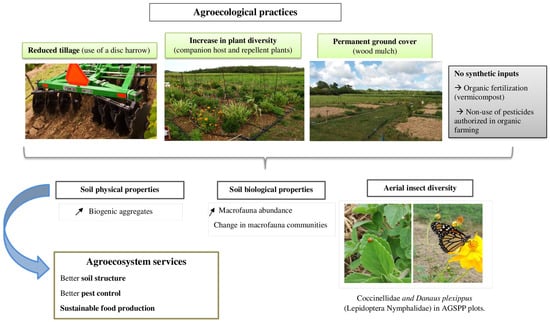Agriculture is a vital activity for human societies that is expected to feed some 9 billion people by 2050. Currently, one of the main challenges for agriculture is to provide enough food for the growing world population while preserving the environmental quality [10,11]. Agroecology offers concepts, tools, and practices allowing the coherent use of ecological processes and the valuation of natural resources [12]. It uses methods based on multifunctionality and biodiversity to enhance ecological processes and the related ecosystem services [13]. Reduction in tillage, crop rotation and the increase in plant diversity, organic fertilisation, or permanent soil cover, are all popular practices in agroecological production systems [14]. All of these strategies share the same objective of minimizing or suppressing the use of synthetic inputs, enhancing organic matter recycling, and improving the health of agroecosystems, while maintaining high production levels [15]. However, the effect of these diverse agroecological practices on soil fauna communities remains poorly documented, in particular in the Caribbean region [11,16]. Growing awareness and increasing evidence that soil biodiversity is inextricably linked to the provision of soil-based ecosystem services appears in the literature [17]. Therefore, defining and designing cropping systems that better consider the belowground biodiversity and soil ecological processes are fundamental [18,19].