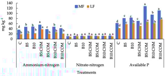 As indicated in Figure 1, no significant differences were observed among the assessed treatments with respect to soil NO3−-N content, with obtained values descending in the order B5:CHM > B10:COM > B10:CHM > B10 > B5 > B5:COM > C for the MF soil, and B10:CHM > B5:CHM > B10 > B5:COM > B10 > B10:COM > C for the LF soil. For the MF soil, the highest NO3−-N content (12.09mg kg−1) was detected in soil receiving the B5:CHM treatment, whereas for the LF soil, the highest value (12.23 mg kg−1) was obtained in response to the B10:CHM treatment. For both soils, the lowest values were obtained in response to the respective control treatments, measured at 10.0 and 9.5 mg kg−1 for the MF and LF soils, respectively.