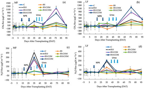 The CH4 and N2O fluxes from both soils under the different treatments are shown in Figure 2. In the case of the MF soil, we detected only low CH4 fluxes prior to 20 DAT, after which we observed notable fluctuations, with an initial small peak being observed at 35 DAT. Thereafter, we detected a markedly increased fluctuation, with the highest peak being recorded at 76 DAT (1205.9 μgC m−2 h−1) in soil receiving the B5:COM treatment (Figure 2a). Comparatively, soil amended with B5:CHM showed the lowest flux (−114.6 μgC m−2 h−1), recorded at 51 DAT. Similar fluctuations in CH4 were observed in the LF soil, with the highest peak being detected at 76 DAT (1184.9 μgC m−2 h−1) in soil amended with B10:COM (Figure 2b), and the lowest flux was observed at 35 DAT in soil receiving the B5 treatment (−194.8 μgC m−2 h−1). For both soils, however, we found only small CH4 fluctuations during the vegetative stage of rice growth.