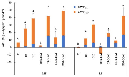 Figure 3 presents data obtained for the values of GWPtotal measured during the 96-day treatments, which indicate a similar trend of GWPtotal in both assessed soil types, arranged from lowest to highest as follows: B5:CHM < C < B10:CHM < B5 < B10 < B5:COM < B10:COM. Accordingly, for both soil types, B10:COM contributed to the highest GWPtotal.