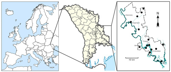 Location of the study area and sampling sites (●) in the Lower Dniester Valley. White circles represent geographic position of towns.
