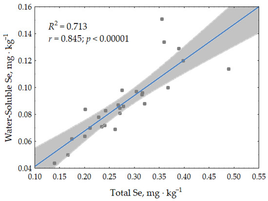 The average water-soluble Se decreased in a similar sequence as the soil types. Generally, soils have 0.09 ± 0.03 mg·kg−1 of water-extractable Se forms, which is 32.1% of their total content. Nonetheless, even though total Se was noticeably higher in alluvial soils, an analysis of statistics revealed no significant differences for mobile Se concentrations in various soil types (Table 2). A regression analysis was conducted to examine the correlation between the total Se content and its water-soluble forms in soil. The results are shown in Figure 2, indicating a high positive linear correlation (r = 0.845, p < 0.00001). It is evident that water-soluble Se in the topsoil layer of the Dniester Valley increased with the rising total Se content.