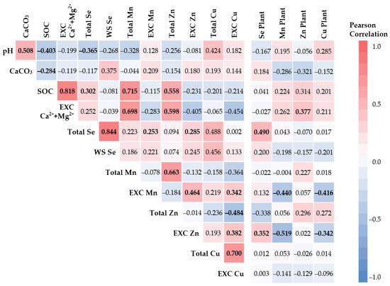 As reported above, Se in plants was positively correlated with its total content in soils. Furthermore, a positive correlation was observed between Se in plants and the content of the mobile forms of Zn in soils (r = 0.352, p < 0.05). No antagonistic effects on Se accumulation by HMs in plants were found. Conversely, negative relationships between metals were more common. Indeed, the increase of EXC Mn in soils negatively affected the content of Mn (r = −0.440, p < 0.01) and Cu (r = −0.416, p < 0.01) in plant tissues. Similar relationships were found between EXC Zn and the content of Mn (r = −0.519, p < 0.001) and Cu (r = −0.342, p < 0.05) in the aboveground plant biomass.