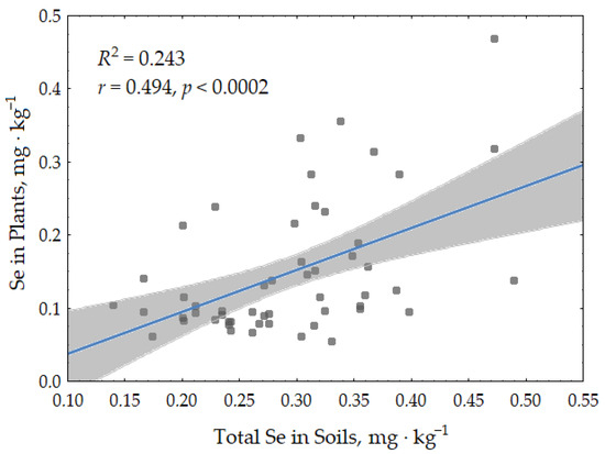 Sunflowers had the highest Se accumulation capacity among the studied plants. Their tissues contained from 0.08 to 0.58 mg·kg−1 of this element with a mean value of 0.23 mg·kg−1, while wheat and couch grass contained 0.15 and 0.12 mg·kg−1, respectively. A slight positive correlation (r = 0.494, p < 0.001) was observed between the Se content in plants and the total Se in soils (Figure 4). Conversely, no relationship was found between the water-soluble Se and its concentration in plants (Figure 3).