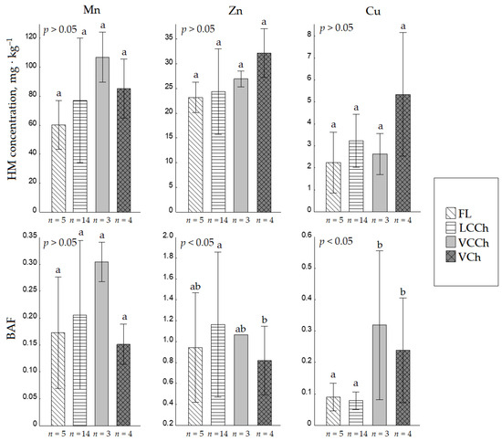 It is obvious that there was variability in HM accumulation and HM content in plants among different soil types. However, according to Kruskal–Wallis ANOVA, the reliability of these differences (p < 0.05) has only been established for the BAFs of Zn and Cu, but not for Mn BAF as well as HM concentrations in plant tissues.