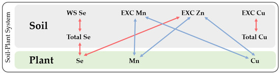 Se and HM interrelations in the soil–plant system in the Lower Dniester Valley are summarized in Figure 6.