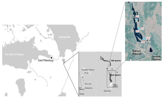 Geographical location of the sample collection sites. Northwest of Russia, Leningrad region, Kirovskiy district. M1–M5—indicating the points of sampling.