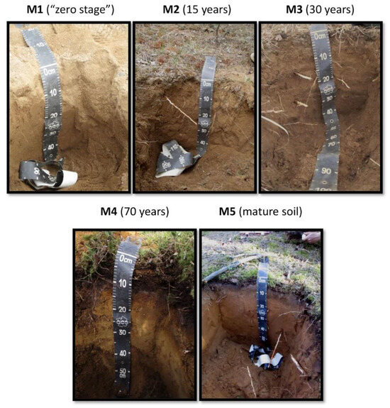 The second type of soil evolution study describes microbial succession in disturbed soil environments, including former mining sites [23,24,25,26], areas of deglaciation [27,28,29], post-fire ecosystems [30,31], and volcanogenic soils [32]. The basic methodology of these studies has been to convert time into a spatial gradient, resulting in the ability to visualize continuous stages of soil evolution, which are known as chronosequences [27,33]. Soil chronosequences represent successive stages of soil formation, starting from the same parent material and evolving in a specific climatic zone [21].