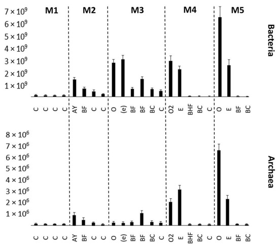 Number of bacteria and archaea expressed in amounts of 16S rRNA or internal transcribed tracer sequences per gram of soil (y-axis), estimated by quantitative PCR. Error bars represent the SDs of the values. M1–M5 represent stages in the soil succession. C—initial parent material, not altered by pedogeneis, Oi—initial litter, not altered by organic matter transformation process, Oe—litter, slightly transformed by enzymatic processes, AY—humus accumulative superficial soil horizon, BF—illuvial iron-oxide horizon, (e)—entic podzol horizon, BHF—illuvial iron–oxide–humic complexes horizon. BC—transitional horizon between illuvial horizon and parent material.