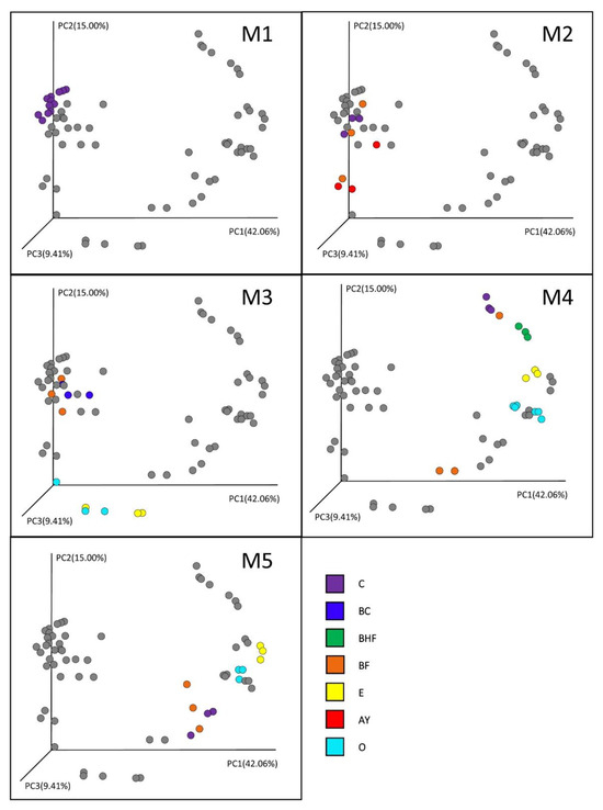 Beta diversity in the soil horizons of different genesis. Distances between the samples were calculated using the weighted UniFrac method. PCoA1, 2, and 3 represent the axes of the PCoA plot with the percentage of explained variance. O, E, AY, BHF, BF, BC, and C are the soil horizons. M1–M5 represent sequential stages in the soil succession. Gray dots are marking all the samples to show the range of microbial dynamic shifts in each stage.