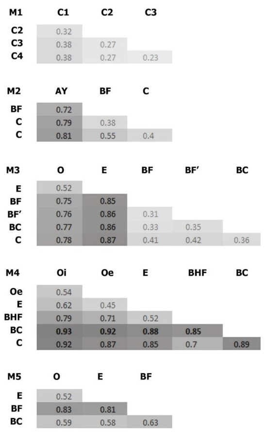 Bray–Curtis dissimilarities of the soil samples. O, E, AY, BHF, BF, BC, and C are soil horizons. BF’ refers to the lower part of BF horizon in M3 (these parts differed in density, however this difference was within density values of the same horizon). M1–M5 represent stages in the soil succession.