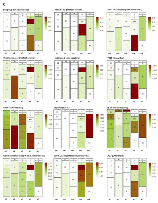 Distribution (heat map) of specific taxa in the soil profiles (the pictures were drawn to show the exemplary spatial architecture of the soil profile, using the depth measurement of the soil horizons). Only taxa with significant differences in their abundances (expressed as the percent of the total microbial number of the amplicon library, marked with color range from red—the most abundant to white—the less abundant) are shown. A–C are the phylotype groups, separated according to their tendency to concentrate in particular parts of the soil profile. O, E, AY, BHF, BF, BC, and C are soil horizons.