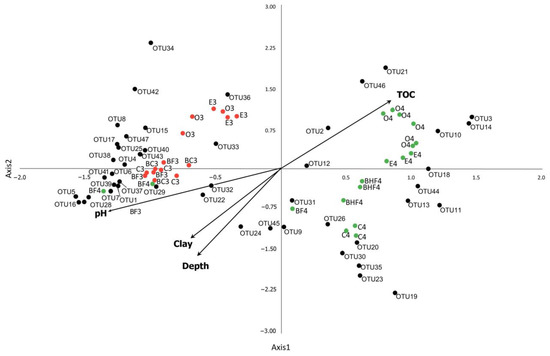 CCA plot of the dominant phylotypes (>1% in the dataset) in Stages M3 and M4 (OTU 1–47). OTU1—Nitrososphaeraceae_NA (Archaea); OTU2—Bradyrhizobium_NA (Proteobacteria); OTU3—WD260_NA (Proteobacteria); OTU4—RB41_NA (Acidobacteria); OTU5—Rhizobium etli (Proteobacteria); OTU6—Arthrobacter sp. (Actinobacteria); OTU7—RB41_NA (Acidobacteria); OTU8—Comamonas sp. (Proteobacteria); OTU9—Gemmatimonadaceae_NA (Gemmatimonadetes); OTU10––Mycobacterium sp. (Actinobacteria); OTU11—Acidobacteriales_NA; OTU12—Xanthobacteraceae_NA (Proteobacteria); OTU13—Subgroup 2 (Acidobacteria); OTU14—Xanthobacteraceae (Proteobacteria); OTU15—Ideonella (Proteobacteria); OTU16—Massilia sp. (Proteobacteria); OTU17—Pseudomonas sp. (Proteobacteria); OTU18—Solirubrobacteraceae_NA (Actinobacteria); OTU19—Candidatus Udaeobacter (Verrucomicrobia); OTU20—Subgroup 2_NA (Acidobacteria); OTU21—Chitinophagaceae_NA (Bacteroidetes); OTU22—Subgroup 6_NA (Acidobacteria); OTU23—TK10_NA (Chloroflexi); OTU24—RB41_NA (Acidobacteria); OTU25—Variovorax sp. (Proteobacteria); OTU26—Subgroup 2_NA (Acidobacteria); OTU27—MND1_NA (Proteobacteria); OTU28—Bacillales_NA (Firmicutes); OTU29—Corynebacterium sp. (Actinobacteria); OTU30—Thaumarchaeota group 1,1c_NA (Archaea); OTU31—Beijerinckiaceae_NA; OTU32—Subgroup 6_NA (Acidobacteria); OTU33—Mycobacterium sp. (Actinobacteria); OTU34—Subtercola sp. (Actinobacteria); OTU35—AD3_NA (Chloroflexi); OTU36—Burkholderia multivorans (Proteobacteria); OTU37—Myxococcales_NA (Proteobacteria); OTU38—KD4-96_NA (Chloroflexi); OTU39—Gaiellales_NA (Actinobacteria); OTU40—Ellin6067_NA (Proteobacteria); OTU41—Stenotrophobacter terrae (Acidobacteria); OTU42—Variovorax sp. (Proteobacteria); OTU43—Xanthobacteraceae_NA (Proteobacteria); OTU44—RCP2-54_NA (Proteobacteria); OTU45—Candidatus Udaeobacter sp. (Verrucomicrobia); OTU46—Chthoniobacter sp. (Verrucomicrobia); and OTU47—IS-44_NA (Proteobacteria). NA—non-attributed sequence. M3 stage (red dots) is represented by O, E, BF, BC and C horizons (each point is shown in several replications), M4 stage (green dots) is represented by O, E, BF, BHF and C horizons, marked by 3 and 4, correspondingly. The CCA axes show the magnitude of the variation in the abundance of the microbial phylotypes (OTUs) as well as soil horizons attributed to the values of the main physicochemical soil properties (pH value, clay particles content, the percent of total organic carbon (C) and depths of sampling).
