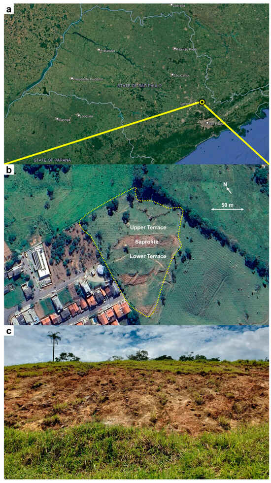 Satellite photographs showing (a) the location of the Morungaba study site within the state of São Paulo, and (b) the outer perimeter of the study site, with the positions of the upper terrace, lower terrace, and saprolite slope indicated. Photograph (c) depicts the saprolite slope studied in this paper, as seen from the lower terrace.
