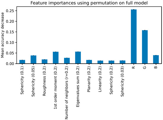 Quantitative assessment of selected feature contributions to model the accuracy of the SfM point cloud vegetation classification. R, G, and B refer to red, green, and blue, respectively.