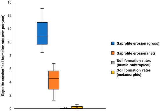 Rates of saprolite erosion for the three plots of exposed saprolite measured in this study compared with the rates of soil formation for similar climatic (humid subtropical; n = 27) and lithological (metamorphic; n = 80) contexts, compiled from the inventory published by Evans et al. [47]. Gross erosion rates refer to the erosion of saprolite without accounting for deposition inputs (e.g., material transported upslope). Net erosion rates refer to the total loss of saprolite when this deposition is considered. Horizontal middle bars represent median values. Upper and lower tails represent maximum and minimum values.