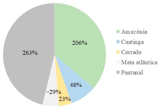 The deforestation of Brazilian biomes (Figure 1), especially the Amazônia, with the justification of food production is not consistent. While 77% of agriculture farms in Brazil are family farms, distributed across 23% of agricultural areas in the country [116], that produce the largest amount of food that feeds Brazilians, the majority of the areas belong to a minority of farmers, producers generally of commodities. Agriculture and pasture areas occupied 31.15% (265 Mha) of the Brazilian territory in the year 2021, and of this value, the pasture and soybean areas represented, respectively, 17.77% and 5.05% [3].