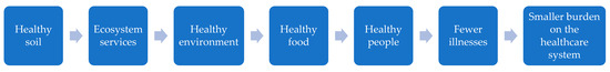 The World Health Organization [21] exposes that poor diets with excessive fat, refined carbohydrate intake, and low fruit and vegetable intake cause obesity and contribute to a large proportion of non-communicable diseases in the World Health Organization European Region; globally, around 45% of deaths in children under 5 years of age are linked to undernutrition. Accelerating decreases in soil quality and biodiversity will affect access to food and its dietary diversity and nutritional value. Evidence also suggests that dietary diversity plays an important role in the gut microbiome, which influences metabolism and other health indices. Specifically, in Brazil, the diversity of the climate and soil makes it possible to produce a diversity of food, supporting dietary diversity and reinforcing the need to improve soil health to meet dietary demands. And this represents a chain, where healthy soil will attend to ecosystem services and produce a healthy environment for food and people, resulting in fewer illnesses and a smaller burden on the healthcare system (Figure 3).