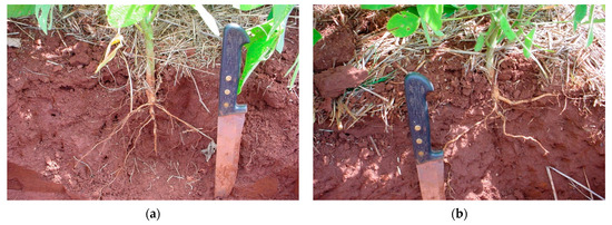 One of the negative impacts of inadequate soil use is compaction, which negatively influences soil structure in terms of properties such as bulk density, porosity, resistance of soil to penetration, and hydraulic conductivity [39,40], affecting nutrient uptake by plants, such as phosphorus and potassium, which are absorbed by plants through diffusion [41], and root growth, compromising crop yield [40,42,43,44]. Soil that is not compacted enables deeper root growth by searching for water and nutrients, while soil compaction limits root growth, hampering the aerial part of the plant and decreasing yield (Figure 5).