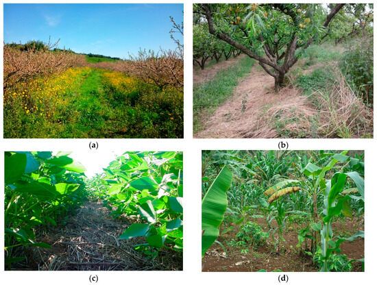 Peach orchard with spontaneous vegetation (a) and oat (Avena sativa) sown as cover crop in inter-rows (b); soybean under no-tillage conditions (c); agroecology system with corn (Zea mays), coffee (Coffea arabica), and banana (Musa spp.) (d).