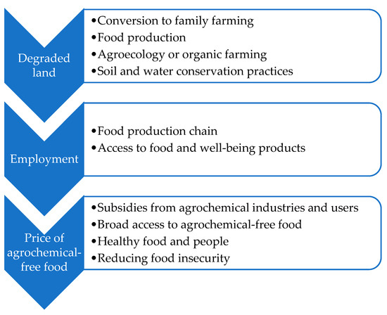 Considering everything that has been exposed, our proposal of public policies follows a sequence of connected events: the degraded land should be converted to family farming for food production, especially agroecology or organic farming, including offering incentives for soil and water conservation practices at the watershed level, and this conversion will create employment opportunities in the food production chain, which means that people will be able to access food and other well-being products. Naturally, food produced via agroecology or organic food are more expensive, but the subsidies from agrochemical industries and users could result in low-cost food free of agrochemicals for consumers, which means healthy food and people. The increment in food production needs to be linked to access in order to decrease food insecurity (Figure 7).