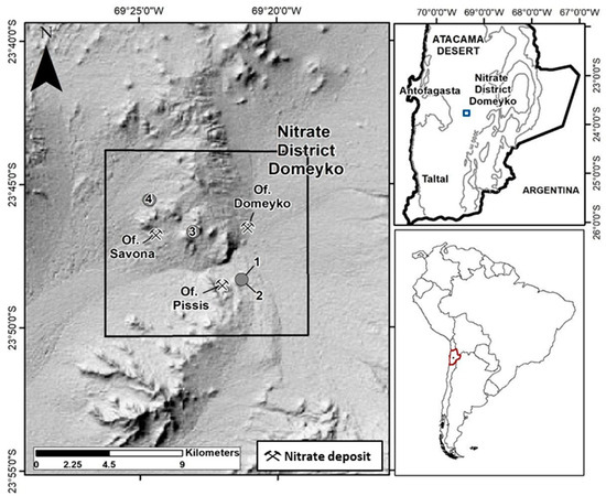 Location of Domeyko District and sampling sites at Oficina Pissis (sites 1 and 2) and Oficina Savona (sites 3 and 4).