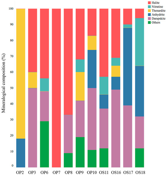 The XRD mineralogical analyses revealed that soils from NID sites consisted of a combination of minerals, including halite (NaCl), darapskite (Na3(SO4) (NO3)·H2O), nitratine (NaNO3), thenardite (Na2SO4), anhydrite (CaSO4), and other salts (see Figure 2). While the salt composition of NID soils was generally similar, variations in their salt contents were observed. However, there were some exceptions to this pattern: the soil at the OP2 site consisted of more than 80% thenardite and less than 20% anhydrite, the soil at the OP7 site was exclusively composed of halite, and neither OP2 nor OP7 contained darapskite. Prior studies on nitrate minerals in the Atacama Desert have identified nitratine (soda niter or Chilean saltpeter), darapskite, and humberstonite (Na7K3Mg2(SO4)6(NO3)2·6H2O) as the most abundant minerals [2,48]. Notably, darapskite is slightly soluble in water [49], and our study only detected it in soil samples that also contained halite.
