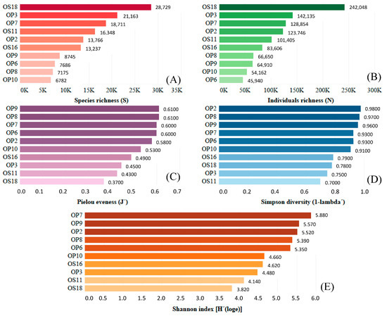 DNA extraction was completed for ten NID soil samples. Quality trimming of the raw sequence data resulted in 1,065,152 reads, with 83,570 sequences remaining after standardization using the Chao1 index for rarefaction. Ultimately, 14,234 operational taxonomic units (OTUs) were identified and defined with a 97% similarity threshold, considering all 10 samples. High levels of alpha diversity, richness, and evenness were observed in bacterial communities across all NID sampling sites studied (see Figure 3). This is evident in the Shannon and Simpson indices, with values ranging from 3.82 to 5.88 and from 0.70 to 0.98, respectively. Furthermore, species and individual richness varied from 6783 to 28,729 and 45,940 to 242,048, respectively. The Pielou evenness index produced values between 0.37 and 0.61. The remarkable microbial diversity discovered in Atacama NID strongly suggests that deliquescent minerals, such as halite, nitrate, and thenardite, provide the necessary moisture to support the development and sustenance of microbial life.
