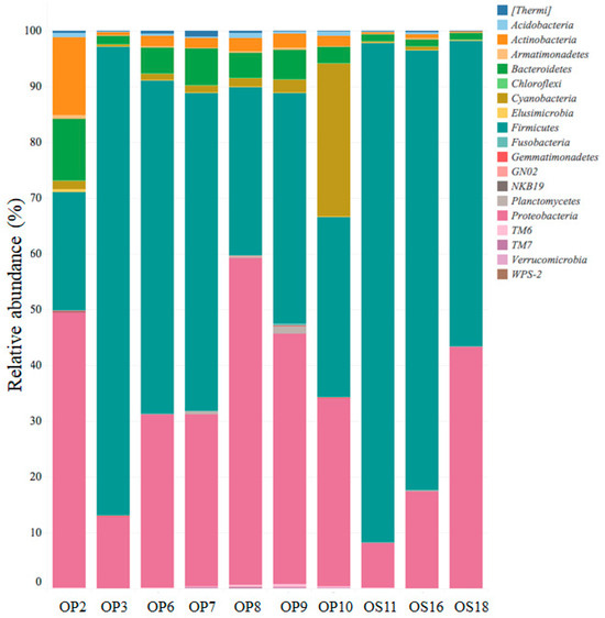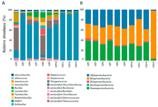 Within NID soil sites, Firmicutes and Proteobacteria were the dominant phyla, with the Firmicutes class exhibiting the highest relative abundance and diversity (refer to Figure 4 and Figure 5A). Notably, soil samples from sites OP3, OS11, OS16, and OS18 showed low diversity but were highly enriched (over 90%) in unclassified Alicyclobacillaceae. In contrast, other NID sites exhibited a more diverse array of microbial genera (see Figure 5A).