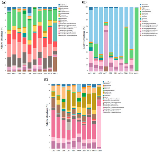The information provided in Figure 6 presents the microbial genera identified within the Proteobacteria phylum in Atacama NID soils. Alphaproteobacteria were represented by Novosphingobium, unclassified Bradyrhizobiaceae, unclassified Rhizobiales, Sphingomonas, unclassified Sphingomonadaceae, unclassified Caulobacteraceae, and Pedomicrobium (see Figure 6A). Notably, Novosphingobium is known as a metabolically versatile bacterium found in various soil environments [55]. The Betaproteobacteria phylum in NID soils exhibited enrichment in genera such as Burkholderia, Limnobacter, unclassified Oxalobacteraceae, and unclassified Comamonadaceae (see Figure 6B). In the case of the Gammaproteobacteria phylum in Atacama NID soil samples, the dominant genera included Pseudomonas, unclassified Pseudoalteromonadaceae, Halomonas, and Vibrio (see Figure 6C).