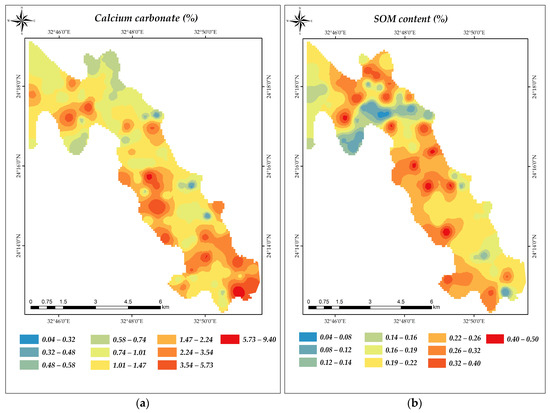 An ordinary kriging interpolation method was used for generating spatial variability maps of the soil properties (SOM, CaCO3, clay, silt, and sand) over the study area. For achieving that, geo-coordinates of the sampling locations and the shapefile (border of the study area) were entered to the geostatistical wizard environment, and then the kriging method was applied. The developed maps were annotated and documented, wherein all mapping requirement (north arrow, legend, scale, etc.) were incorporated.