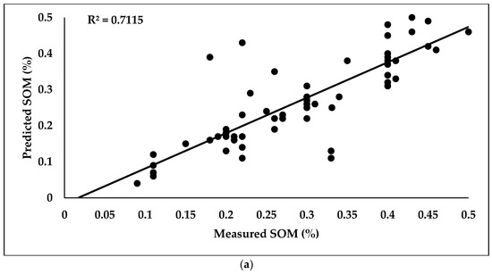 SVM model is a nonlinear model which is commonly used in chemo-metrics, like soil spectroscopy [48], while the standard model is used for a linear classification. This model has low performance in predicting soil parameters compared to the linear regression models. This low accuracy occurs due to the nonlinear regression problems as well as the complexity and heterogeneity of the soil and spectral variables. However, for decreasing this problem, a kernel function [49,50] such as kernel radial basis function (RBF) was found to be a good assistant for enhancing the nonlinear regression relations (Equation (8)).
